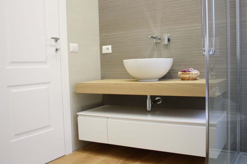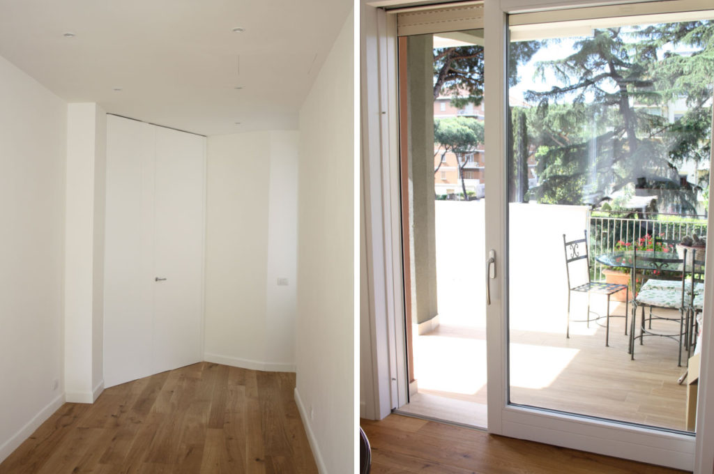 Alla zona notte si accede tramite una porta a tutta altezza integrata in una parete lignea che contiene un’armadiatura, progettata e realizzata artigianalmente su misura.