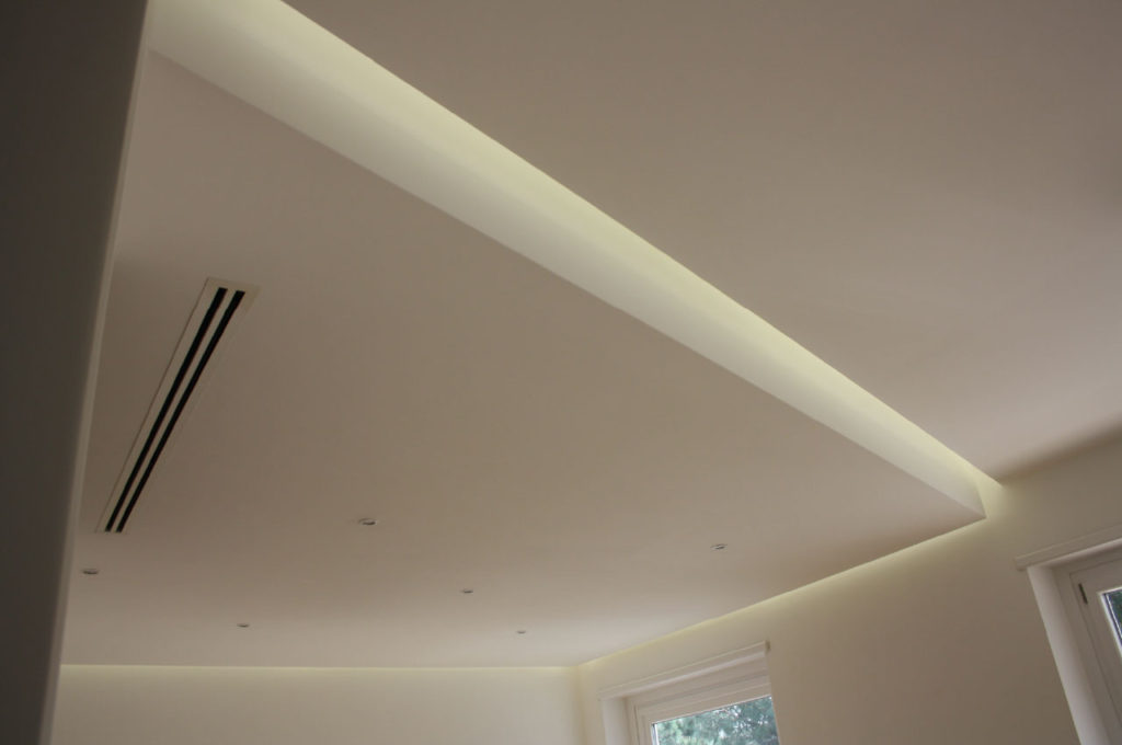 La zona living è caratterizzata da un controsoffitto impostato a quote diverse che marca la divisione funzionale della zona pranzo e del soggiorno.